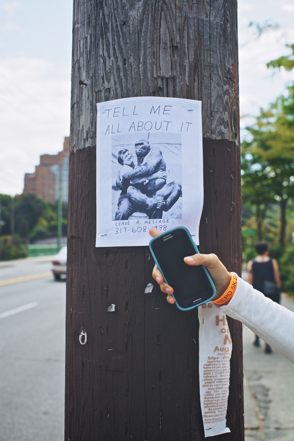 What Zack is hiding behind is a page from "Ledoux Merix", zine by Robert Hardgrave and Jesse LeDoux. In this handmade risograph zine Robert transformed Jesse's drawings into an indescribable medley of imperfection and whimsy. He handed them to the attendees to take home and to serve as a memory of the curiosity experienced during the walk.