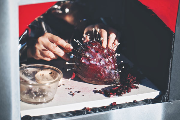 .. and watch a pair of hands making and un-making things in each one of the five windows. Each window had a set of materials. Window #1, for example, had carving tools, beets, pearl tipped pins, vaseline and tweezers.