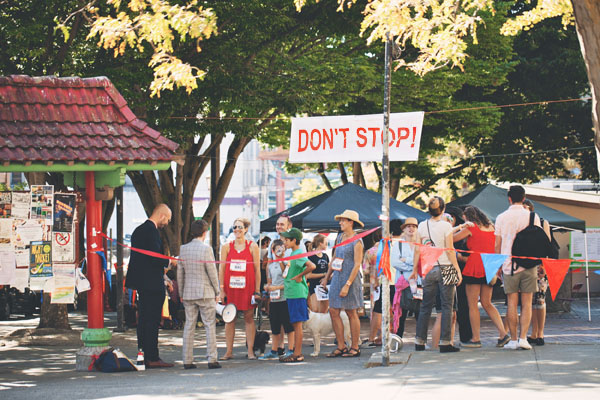 Mel Carter, Anna Erickson, Ripple Fang and co. (a.k.a. Cutie Beauty's "And Friends") created what felt like life-size board game under the freeway underpass. Titled Tea-Sometimes-Party (Un-Holiday Jubilee) feat, this interactive performance piece included karaoke, tea bag toss, puppet show and a completely self-sufficient candy economy.